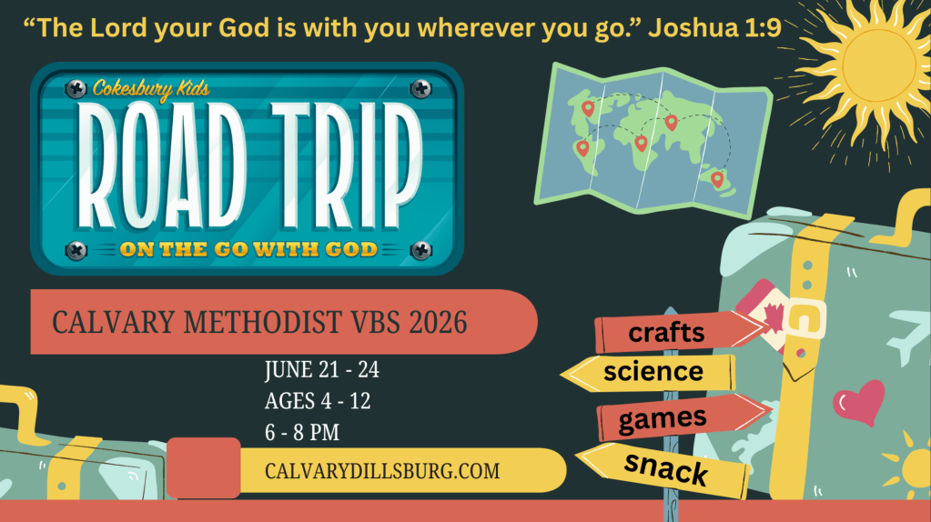 Calvary Methodist “Road Trip” VBS 2026 will be held June 21-24 from 6-8 PM for children ages 4-12 at the Calvary Family Center.